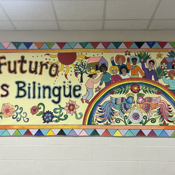 A mural reading “El Futuro es Bilingüe” at West View Elementary School in Muncie, Oct. 16. Reagan Sexton-Godsey, Ball Bearings.