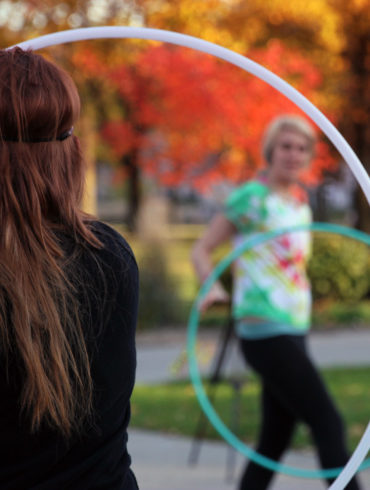 Two students relieve stress by performing with led hoops